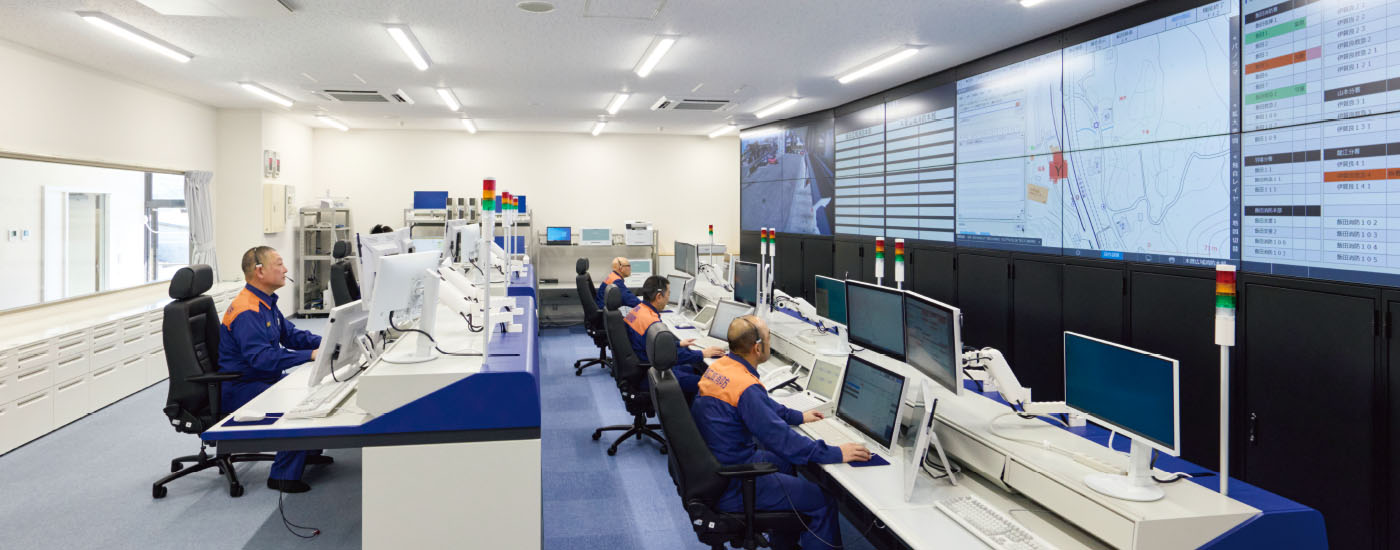 指令センターの前面に配置した大型表示盤では、指令業務で必要となる車両運用状況や気象情報など、多くの情報を同時に確認することができます。複数の指令員により災害発生場所が確認でき、指令内容に関する意思決定の迅速化が可能となります。
