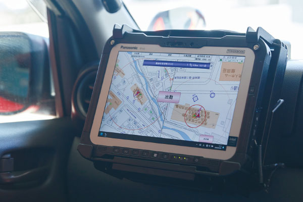 出動経路、各隊の活動状況などが確認ができ、災害現場近くの指揮本部でリアルタイムに災害情報の入力・受信が可能です。